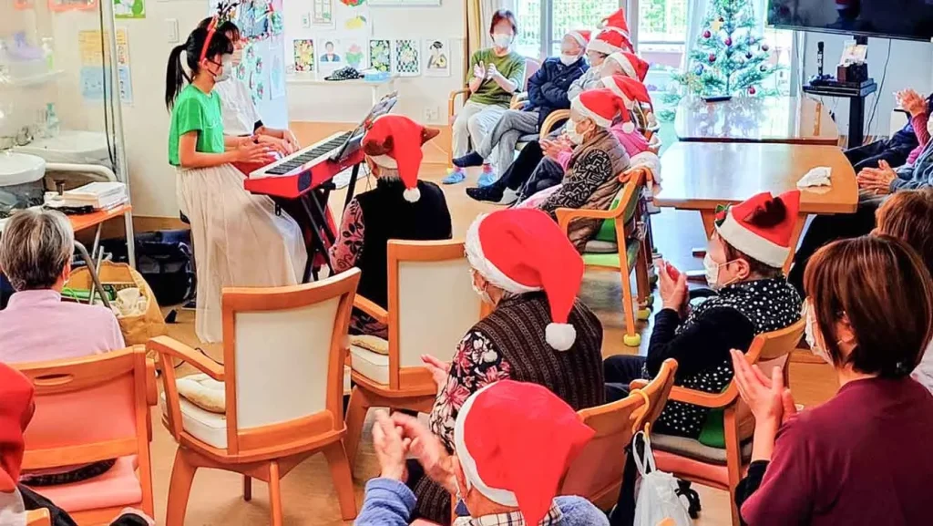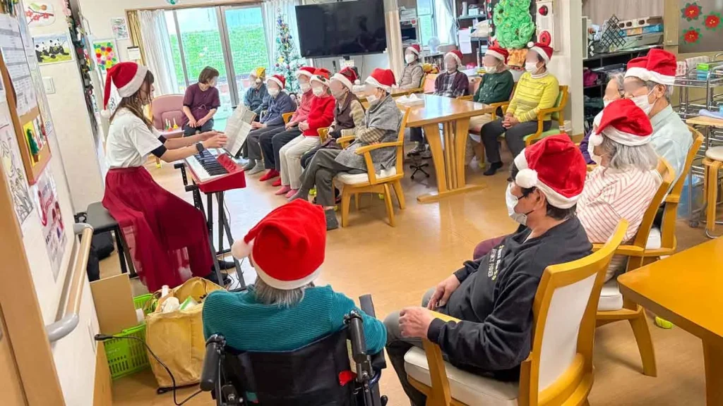 スケッターによるピアノレクリエーション 開催のご報告 2026年2月27日 / お知らせ, 取組み 2025年12月25日、デイサービス生き活きとグループホームおてんとさん合同で、クリスマス会とコラボしたスケッター鵜飼さんによるピアノレクリエーションを開催しました。 リスマスソングや懐かしい曲の演奏にあわせ、利用者の皆さんは口ずさんだり手拍子をしたりと、会場は笑顔に包まれました。 利用者の皆さんはこの日の為に1ヶ月ほど前からハンドベルを練習し、当日演奏すると「もっとハンドベルが上手くなりたい」という前向きな声も聞かれ、これからも皆さんと元気に楽しい音楽の時間を重ねていきたいと思います。